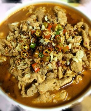 取出调料包中的,辣椒和麻椒包撒在肉上,烧热一点油浇在上面即可。美味的水煮肉片就好啦。