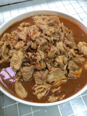 洗锅后倒入少许油 油热后放入葱 姜 剁辣椒 蒜爆香 再加入适量酱油和料酒 出香味以后加入适量高汤或者清水 汤开后加入肉片 熟了就可以出锅啦