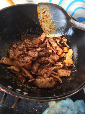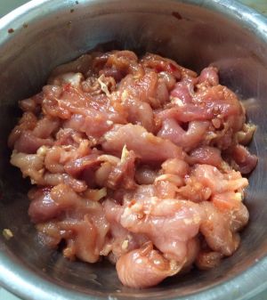 腌制瘦肉,到货料酒,生抽,盐,大蒜生姜末少许,生粉,豆瓣酱一小勺,腌制十分钟