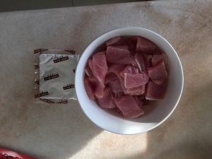 取出腌肉的料包,把肉切好备用。
