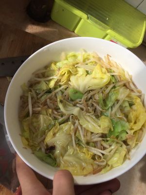准备工作做完后 在锅里放入一点油 烧热后放入豆芽和金针菇 炒熟后放入大碗里备用