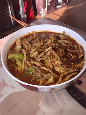 肉先捞起来铺在配菜上面,汤最后倒入碗里