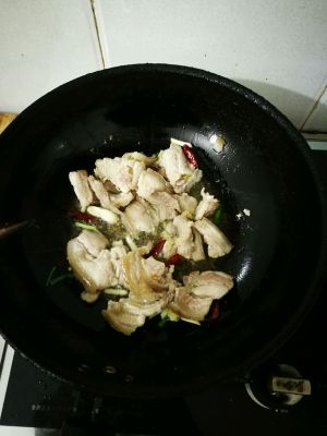把肉放锅里面,炒熟后放入葱姜蒜