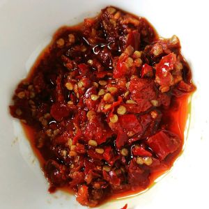 盛入装菜的盆,锅内倒入适量油烧开,将大蒜粒,辣椒面依次(喜欢还可以放小米椒粒)撒在肉上,将油浇在肉上,搞定