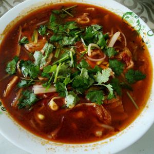 将剩于汤汁倒入盆中,肉片上放葱姜蒜,花椒,干红辣椒,勺内放入麻椒油烧热,用手勺将麻油泼在上面,放香菜,撒白芝麻,即可食用。