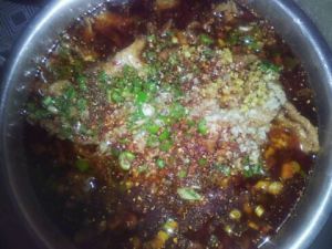 锅内放油,豆瓣酱炒制红油,放料酒,加水适量,酱油调色,盐,鸡精,糖,醋,调味。烧开,