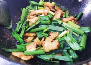 倒入料酒,生抽,少许盐,糖,收汁。倒入蒜苗,翻炒到熟。