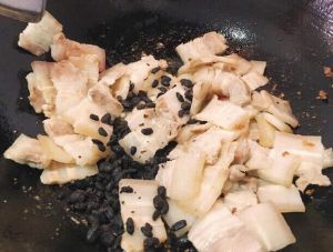 锅内少许油,五花肉下锅炒至出油,加入豆豉,继续翻炒。