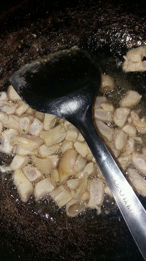 花椒炒出香味,放入葱姜蒜,接着放入腌制好的鸡丁炒至变色