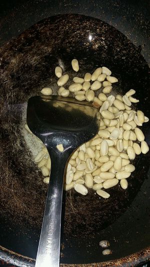 起锅,放入少许油,待油温热用中火炸花生米,翻炒至焦黄,盛出晾凉备用