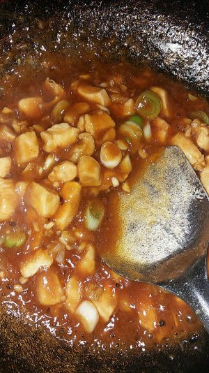 中火起锅,锅里留底油,先放花椒,翻炒几下,再放入葱段,蒜碎,翻炒几下之后,放入鸡丁,翻炒匀,倒入酱汁,转大火。翻匀之后倒入水淀粉。