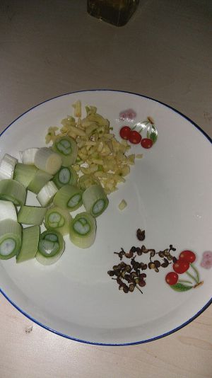 葱白切段,蒜切碎,花椒洗净,备用。