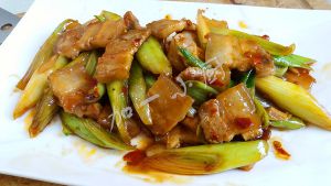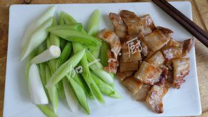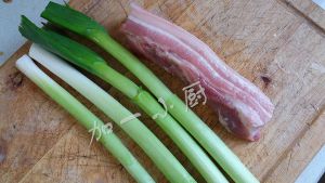 (因有点多余的碎蒜)一块同郫县豆瓣放进去爆香,一次放入蒜苗、肉片爆炒,再放入调味料