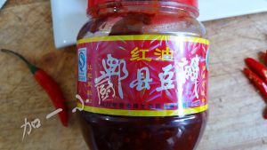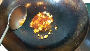 锅内放油加热,然后放入蒜,花椒爆香。再一勺豆瓣酱,炒香豆瓣酱。