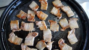 热锅倒油,加入肉片炒三到五分钟。加入姜葱末,青红椒,甜地瓜片,炒两分钟出锅。回锅肉的香浓