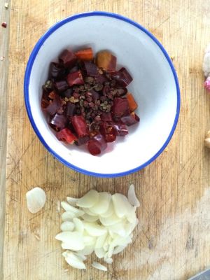 蒜切片,干辣椒切段,如果吃得辣的可以多多的加辣椒,把花椒和干辣椒放在一起,方便等一会入锅