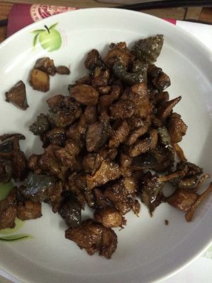 鸡肉切手指头那么大的肉丁,然后加入老抽酱油,料酒,白糖,盐,浅粉(所谓的嫩肉粉)姜丝拌匀!这里盐要适量,因为之后不再加盐。腌个10分钟,按自己时间而定,久一点也没关系,会更入味。