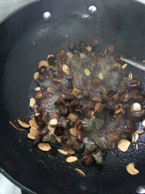 把鸡肉放下,放少许老抽、盐少许、水少许炒匀,盖上锅盖,大火焖5分钟。