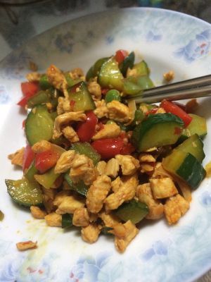 腌制的肉,临下锅前抓上淀粉。宽油,待油热导入鸡丁,快速翻炒。注意:鸡肉外部变成白色,感觉里面还有点泛粉红,就盛出来,这样大概6-7成熟。