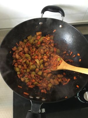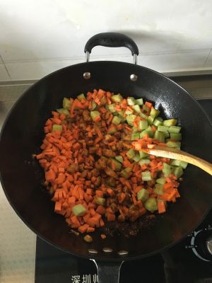 加入黄瓜和胡萝卜丁,翻炒,并加入一小勺食盐。