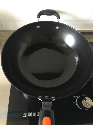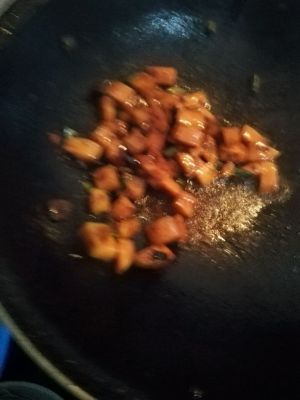 锅内少量油,两勺郫县豆瓣酱,炒出红油,倒入胡萝卜翻炒