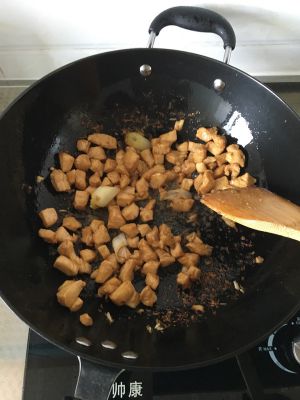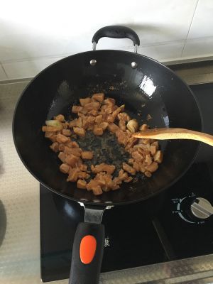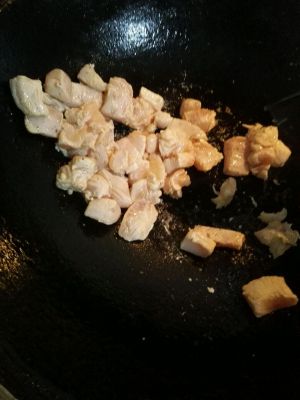 锅内少量油,倒入切好的鸡肉丁翻炒,炒到发白,盛出