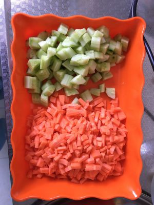 黄瓜、胡萝卜去皮,分别切丁备用。