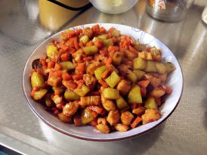 鸡肉,胡萝卜,黄瓜切丁,鸡肉加入少量料酒