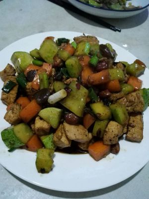 少许三椒油入锅,放葱姜蒜炒香,入胡萝卜丁,青笋丁翻炒,再入鸡脯肉,翻炒5分钟放盐,味极鲜,鸡精少许,花生米,翻炒出锅。