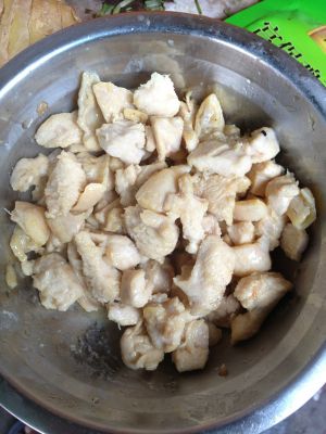把鸡腿去骨切成丁,用料酒,生粉,几片姜淹1小时。