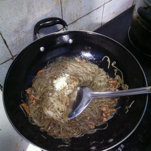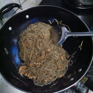 加适量的水 放入粉丝搅一下 最后加入芹菜 翻炒几下即可