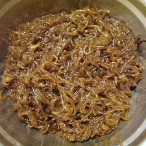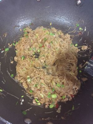待粉丝变色后,倒入酱油。。鱼香肉丝料和酱油都有盐,不用另外加盐了,放入葱花准备出锅。
