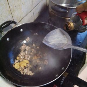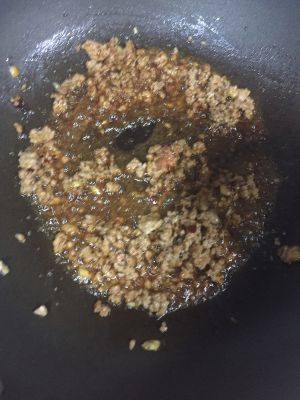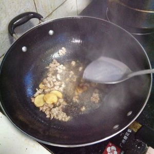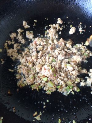 倒入油,放入少量花椒,待花椒变成黑色捞出,小火炒猪肉馅。