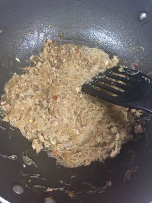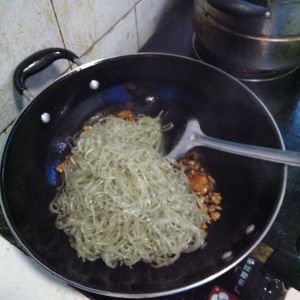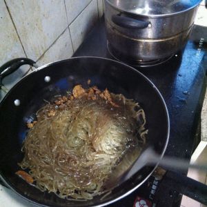 放入鱼香肉丝料,炒猪肉馅,放入龙口粉丝,炒大约两分钟左右。