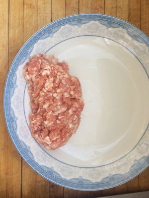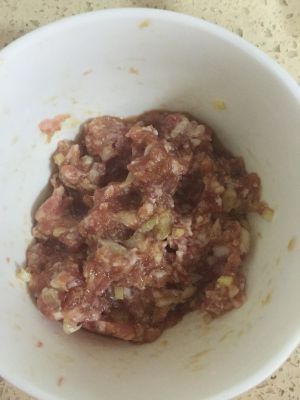 猪肉馅放入葱姜,倒入料酒2茶匙,1茶匙酱油