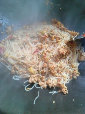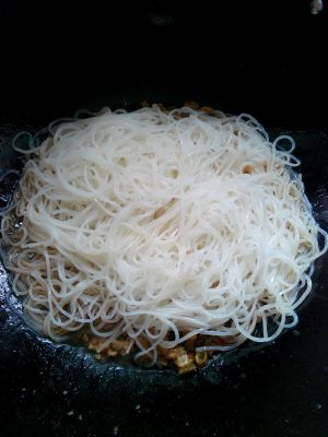 加入生抽、老抽、胡椒、鸡精、盐,适量的水放入粉丝慢慢收干汤汁。