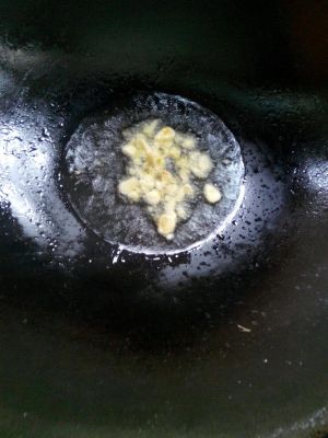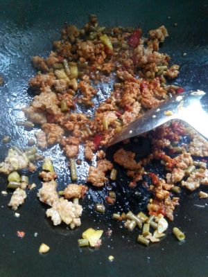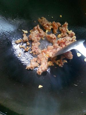 先放入姜和蒜炒香,倒入肉末小火煸炒。