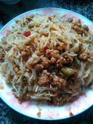 下泡软的粉丝!搅拌均匀后,看粉丝软的程度,放少量水闷煮一下!最后大火收汁!下葱花拌匀!