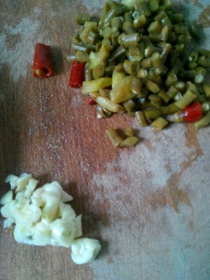 加入酸豆角继续翻炒 放入郫县豆瓣 酱油 盐