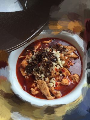 土豆、莲藕切片,笋子切段。锅内烧油,油热后倒入水煮肉片调料包小火翻炒,放入姜片、葱段和花椒,加少量水烧开后放入土豆、藕、笋子,煮几分钟,然后倒入腌好的肉片,煮熟后盛在豆芽碗里。