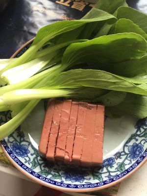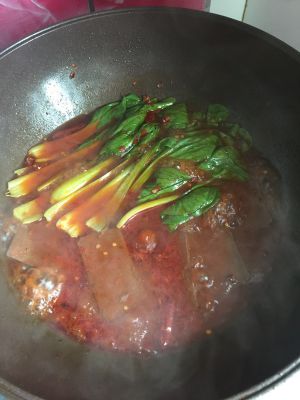 把炒热的酱加水放入上海青和鸭血煮熟,捞出,放入盆中铺底