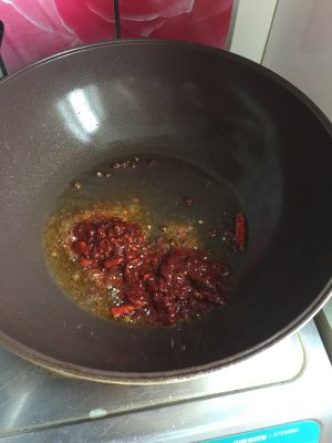 在锅里倒入少许油,放点花椒,辣椒炸锅,再放入郫县豆瓣酱炒热