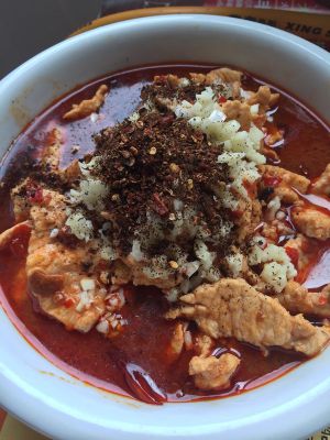 把煮熟的肉倒入铺满上海青和鸭血的盆中,在上面放上之前准备好的蒜粒和花椒辣椒末