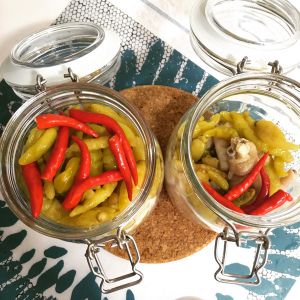 取一个玻璃罐子,放入泡椒连同泡椒水,凉白开,盐,米醋混合,味道要咸些;