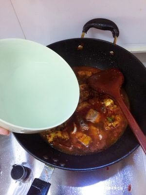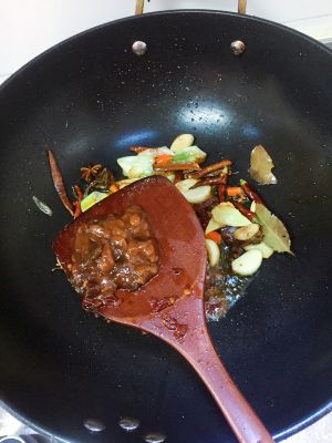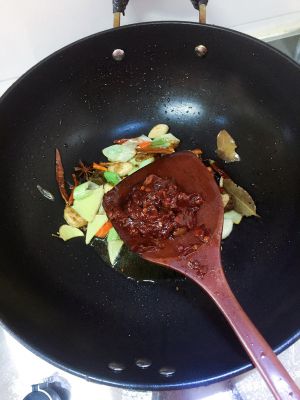 锅烧红,放入清油,带清油冒烟放入排骨炒2分钟,放入姜蒜,花椒,带排骨变成黄色放入豆瓣,酱油和五香八角,炒5分钟,然后加入开水,用锅盖盖着煮15分钟。