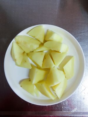 将排骨宰成小块洗净,用开水煮2分钟,然后把土豆切块备用,用切好的土豆放在清水里,以免变色。姜蒜切片待用。