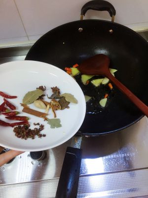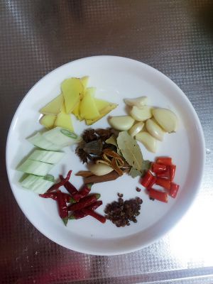 把姜切片,剥少许蒜少许,葱切段,小米辣切段,在拿少许花椒,干辣椒,香叶,肉蔻。白果。八角,陈皮,桂皮备用