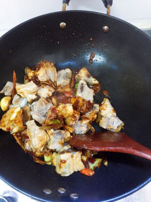 排骨下锅后要不停翻炒,慢慢排骨就变红了,