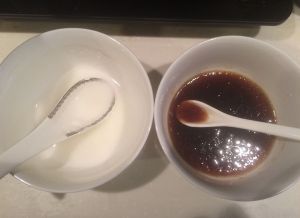 调料备用 一碗是淀粉加水最后收汁用,一碗是香油 酱油 醋 糖 调成料