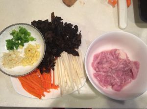 胡萝卜、青椒,黑木耳切丝备用,大蒜、生姜切末备用